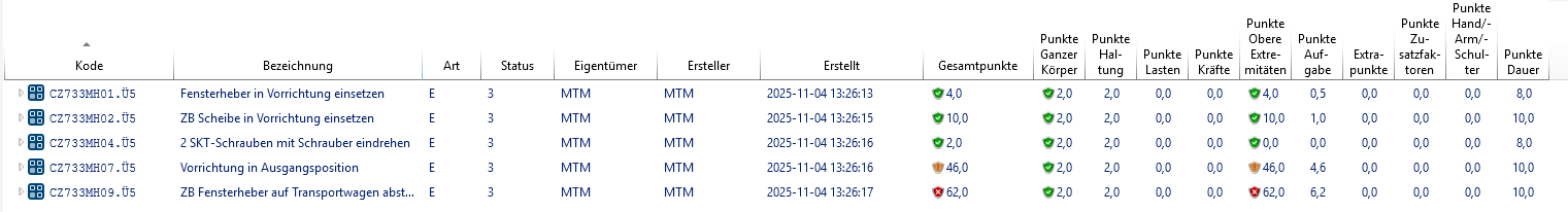 Process elements that have an EAWS evaluation can be displayed in Explorer with the corresponding rating icons for a better overview. To do this, the corresponding columns must be activated in the view options. This view can be printed out via list printing using a customized print form. For more about this, see "Druckformulare" |